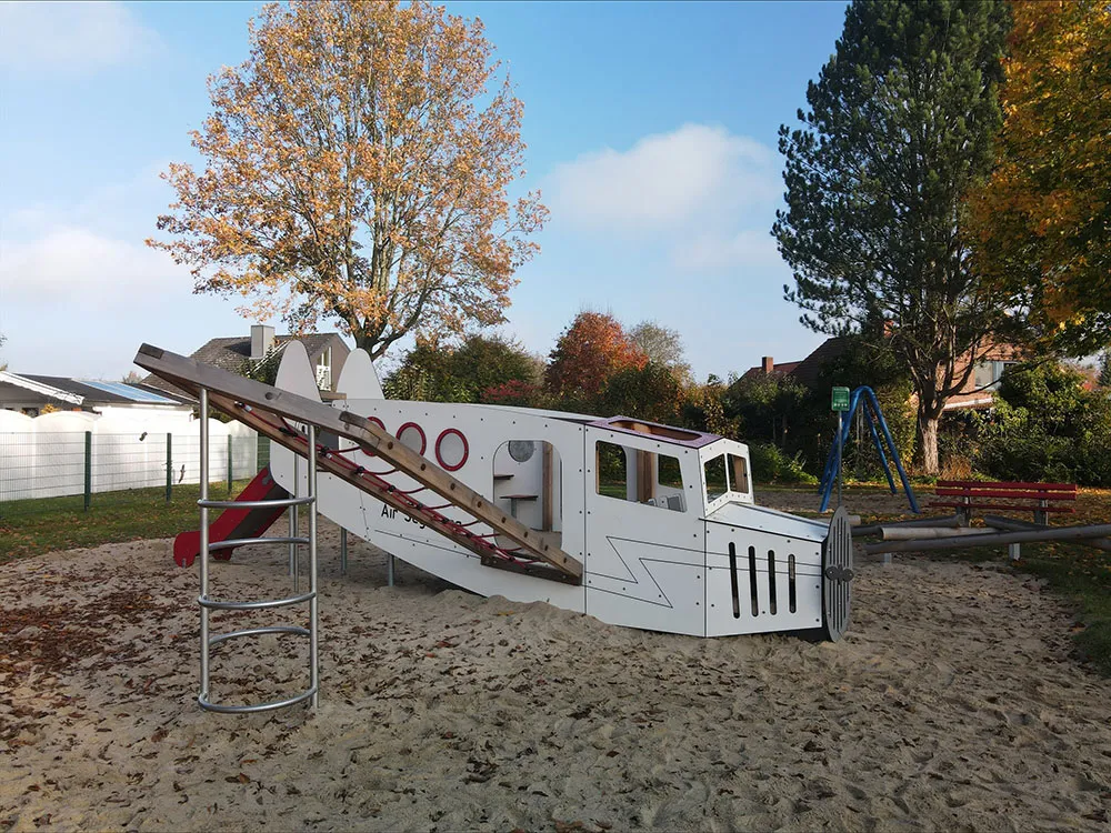 An Bord des Flugzeugs „Air Segeberg“ können die Kinder nach Herzenslust klettern und rutschen, genauso wie am Flugverkehrskontrollturm, von dem sie gern mit viel Gejauchze per Röhrenrutsche in die Tiefe sausen.