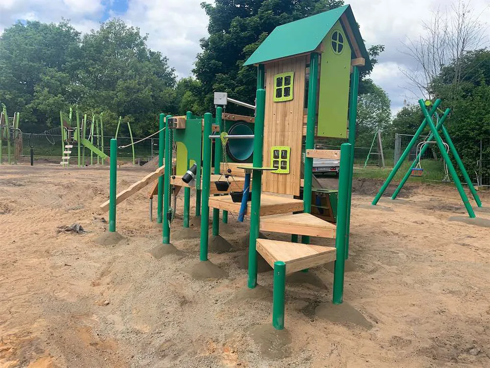 Wir montierten einen Kletterturm mit Rutsche, einen Federwipper, eine Doppelschaukel, eine Kleinkinderschaukel, fantasievolle Spielhäuser, einen Sandbagger und einen Balancierparkour.