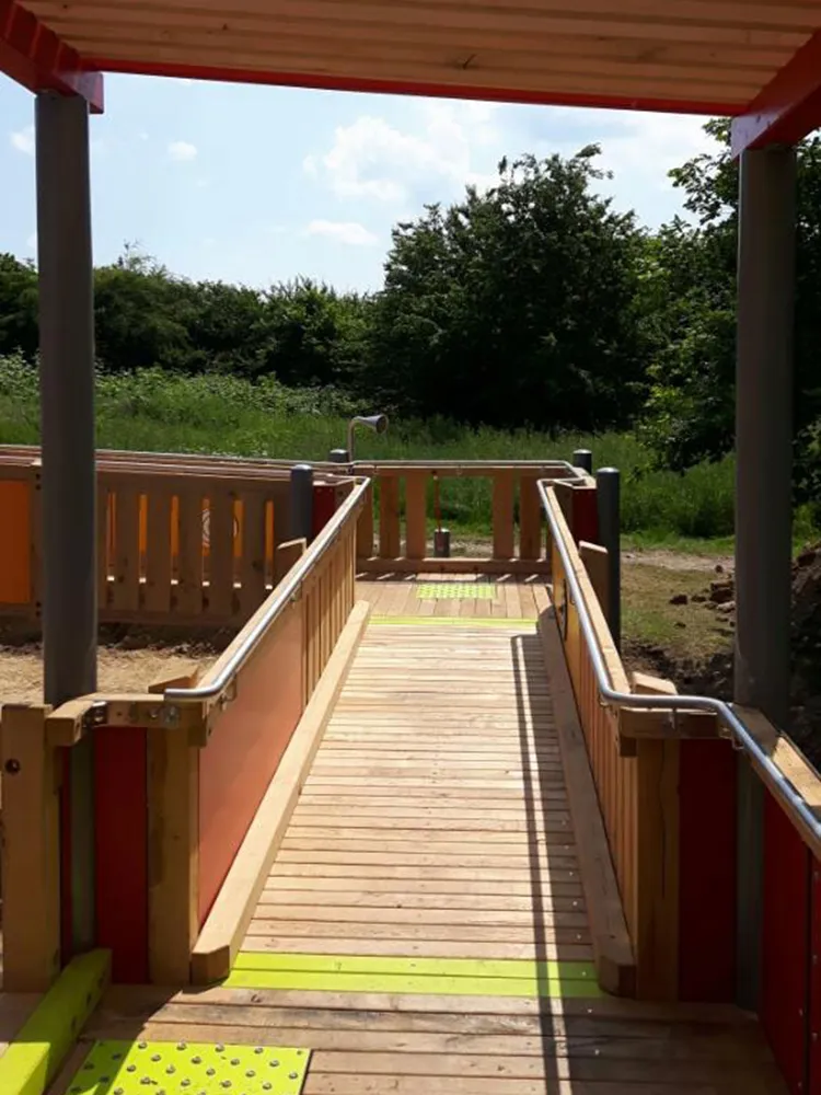 Wir haben eine abwechslungsreiche Spiellandschaft montiert, die für alle Generationen über Rampen zugänglich ist. Konstrastfarbene Bodenelemente mit unterschiedlichen Strukturen erleichtern die Orientierung auf dem weitläufigen Spielgerät.