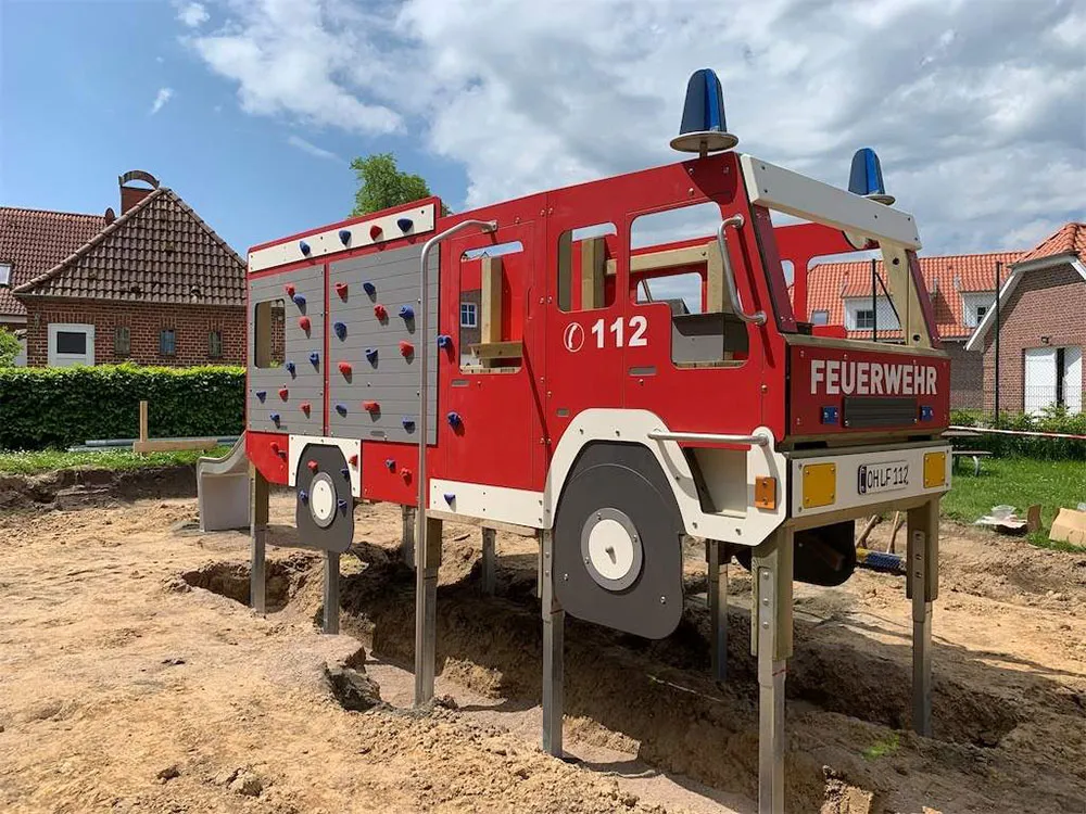Wer hier die 112 wählt, landet möglicherweise auf dem neu gestalteten Themenspielplatz in Sierksdorf. Dazu ist unser Team an die Ostsee ausgerückt, um dort kleine Feuerwehrleute mit einem Feuerwehrhaus und einem Löschwagen auszustatten.