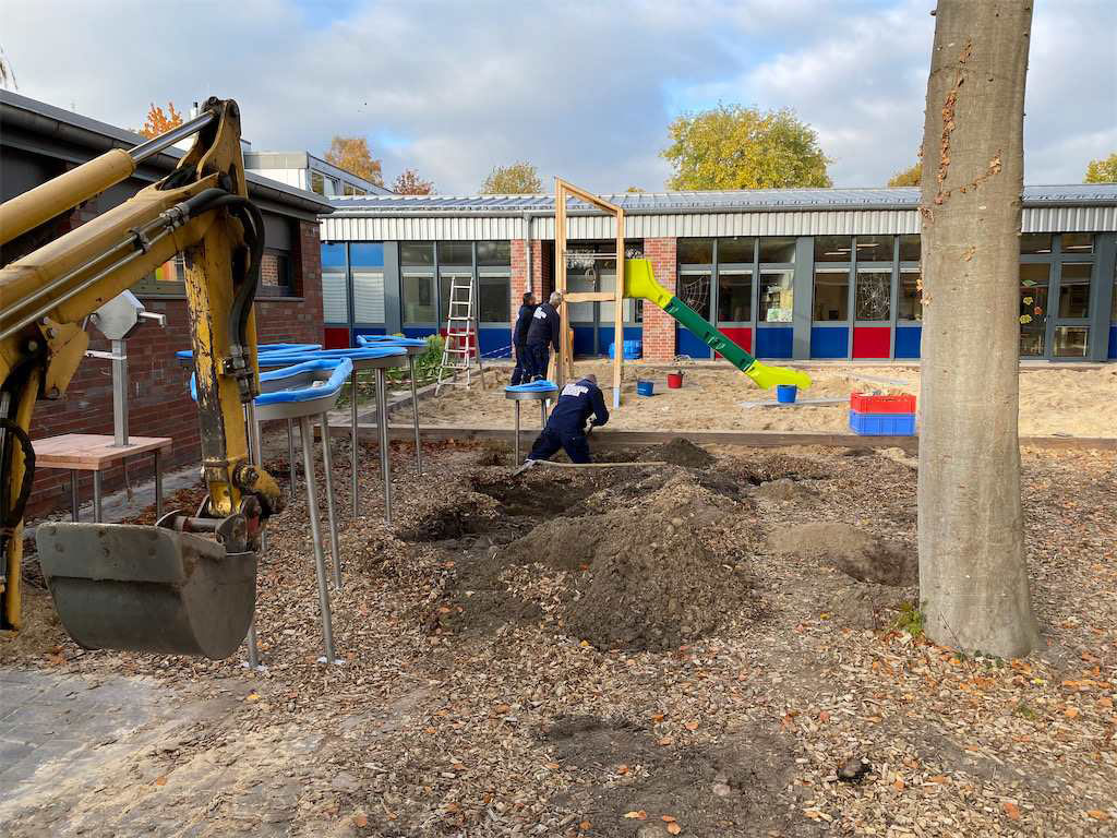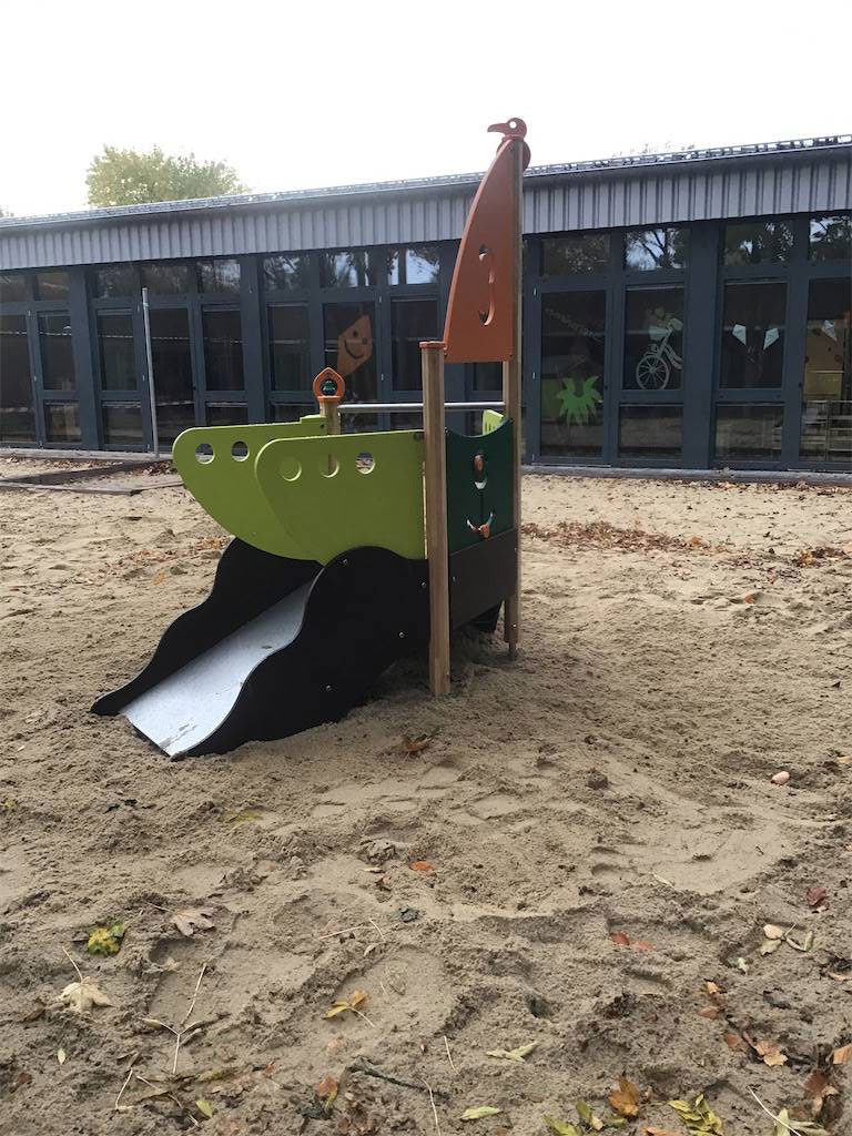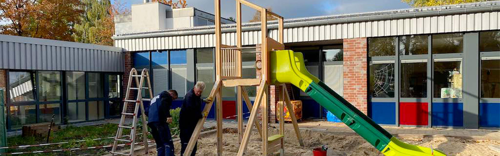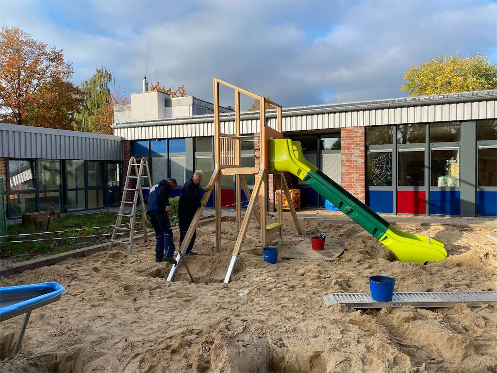 Das große Außengelände des neu gebauten Kindergartens war ideal, um für die Firma Wehrfritz fachgerecht die Spielplatzgeräte zu montieren. Neben einer zweifachen Schaukel, einem Balancierparkour und einem Turm mit Rutsche gibt es dort auch ein Indianer-Tipi und eine Wassermatschanlage. Nun können groß und klein ihrer Bewegungslust, ihrem Entdeckerdrang und ihren zahllosen kreativen Ideen freien Lauf lassen.
