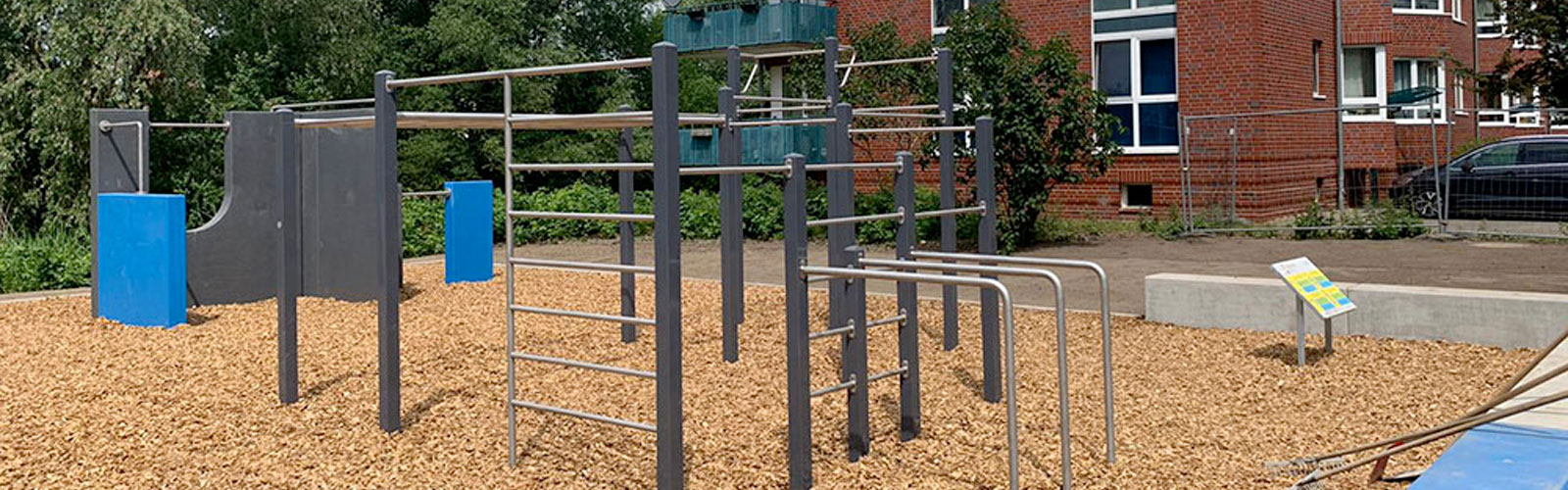 Wir Spielplatz-Macher haben auch eine ausgesprochen sportliche Seite. Also sind wir wieder nach Bergedorf ausgerückt, diesmal, um die Montage einer abwechslungsreichen Outdoor-Fitness- und Parkour-Anlage vorzunehmen. Dazu gehörten Aushub und Planierung des Bodens, Einbetonieren der Wandelemente und Geräte sowie der Bau einer Betonsitzmauer. An den Calisthenics- und Parkour-Geräten trainieren Freunde der sinnvollen Bewegung jetzt Kraft, Ausdauer, Balance und Beweglichkeit.