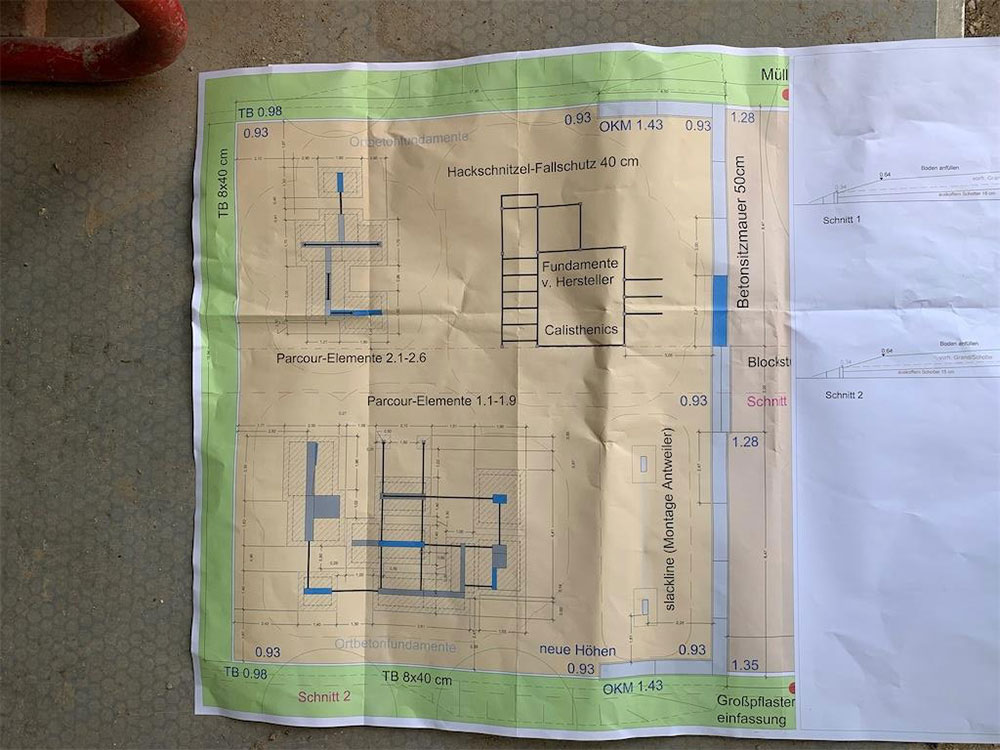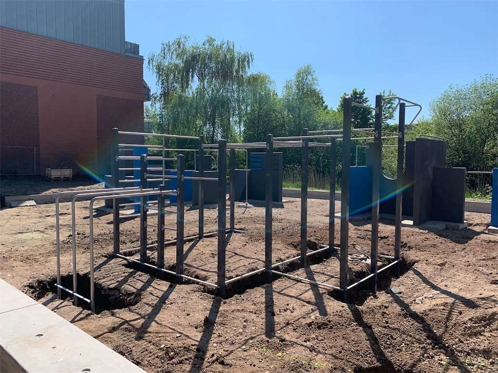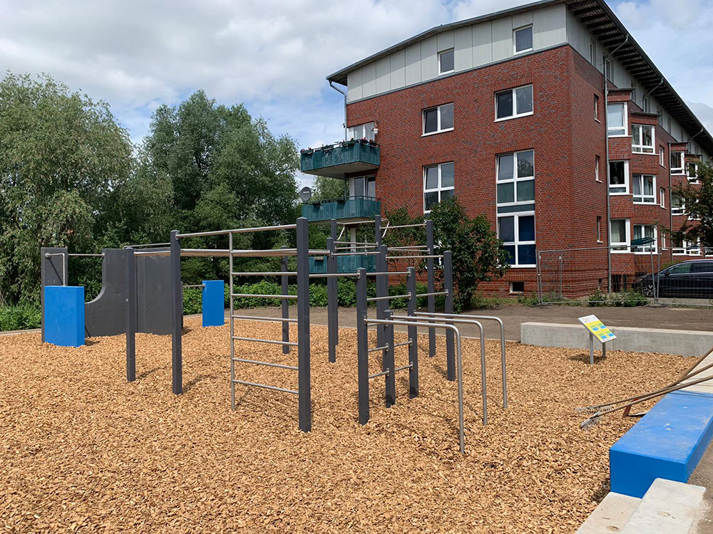 Wir Spielplatz-Macher haben auch eine ausgesprochen sportliche Seite. Also sind wir wieder nach Bergedorf ausgerückt, diesmal, um die Montage einer abwechslungsreichen Outdoor-Fitness- und Parkour-Anlage vorzunehmen. Dazu gehörten Aushub und Planierung des Bodens, Einbetonieren der Wandelemente und Geräte sowie der Bau einer Betonsitzmauer. An den Calisthenics- und Parkour-Geräten trainieren Freunde der sinnvollen Bewegung jetzt Kraft, Ausdauer, Balance und Beweglichkeit.