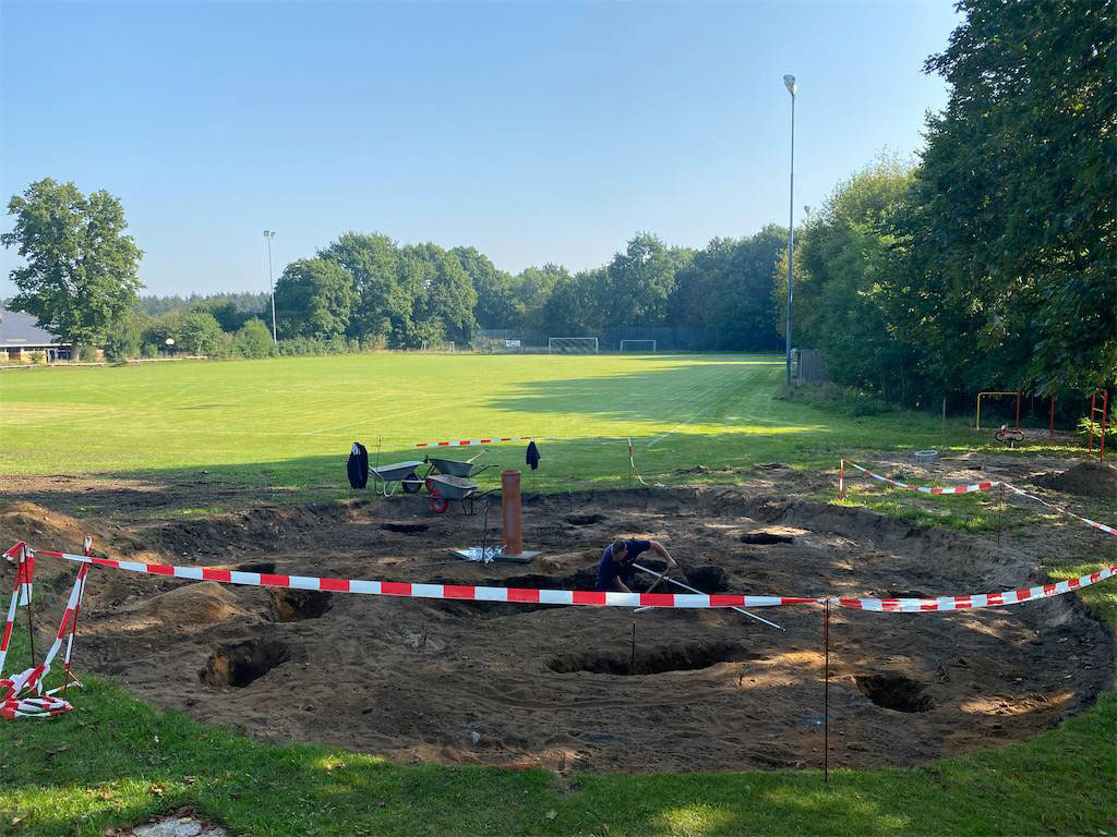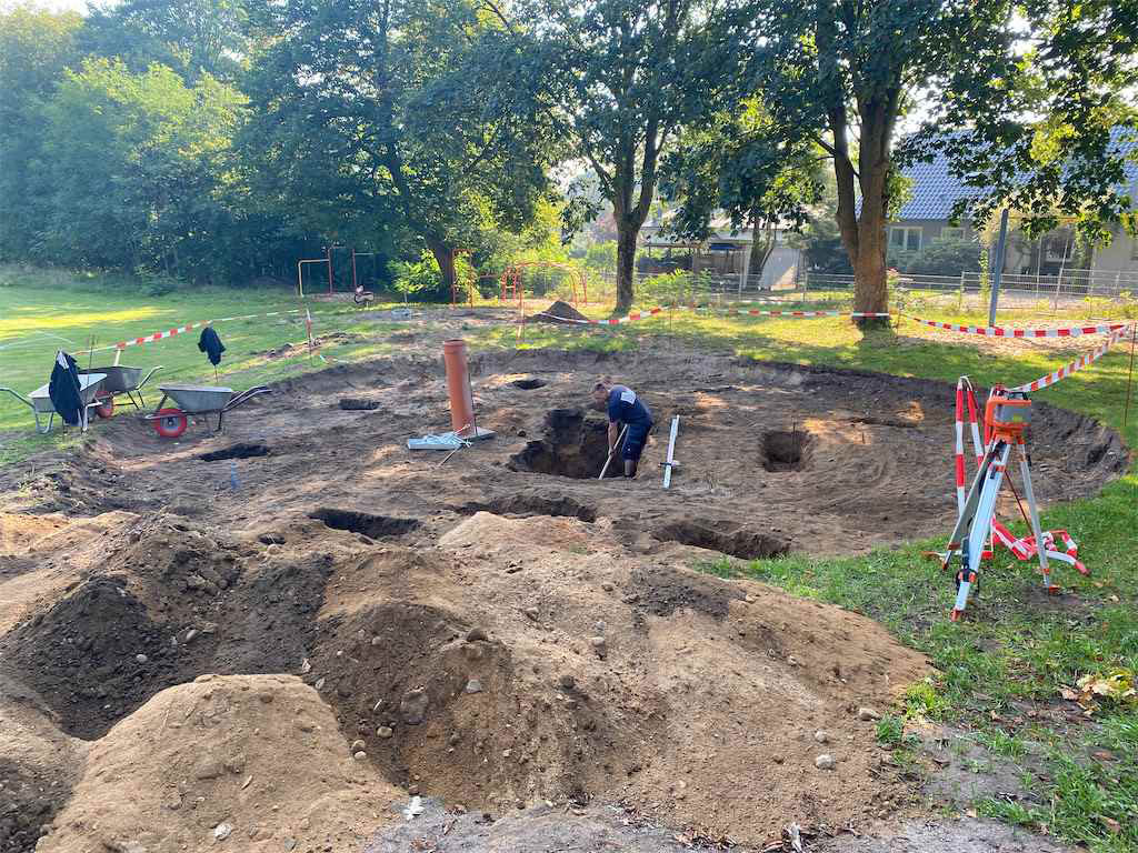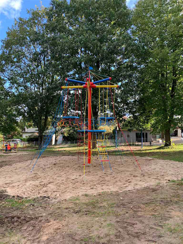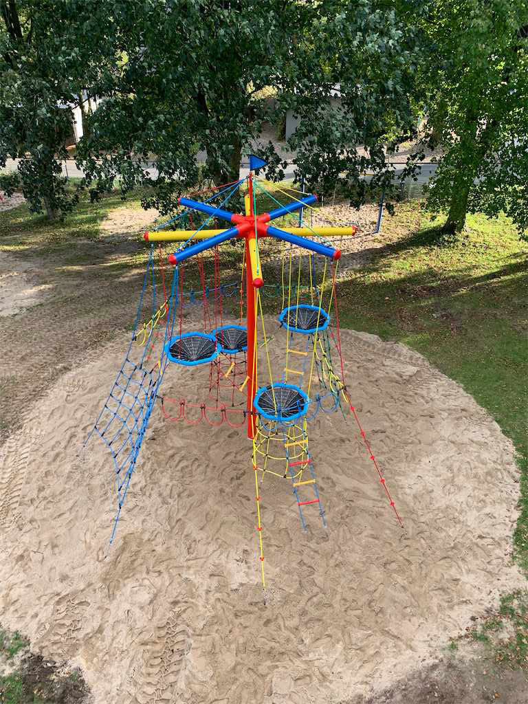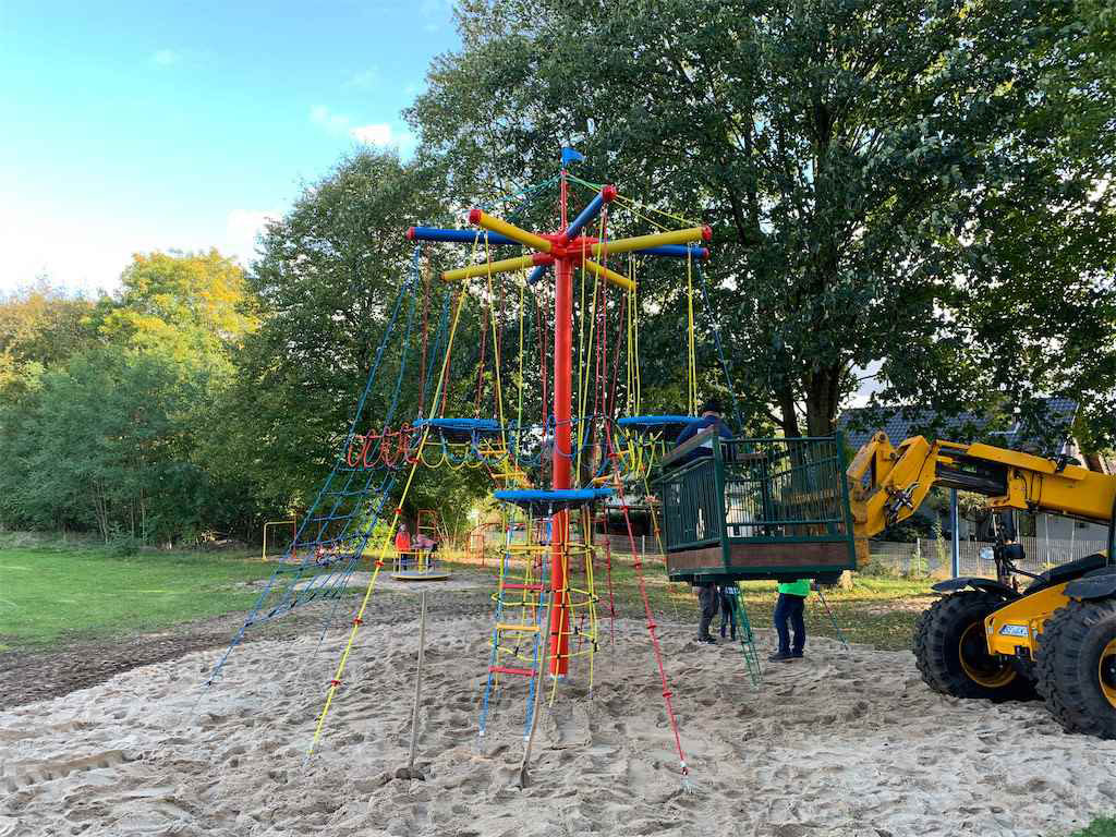 Ganz nach dem Motto aus dem Song von Tim Bendzko haben wir für kleine abenteuerlustige Aufsteiger eine Seilkletterpyramide aufgebaut. Dazu wurden in eine fertig ausgekofferte Fallschutzfläche zunächst mit Beton die Fundamente hergestellt, bevor unser Kran den Mast einschließlich Kletternetz an die vorgesehene Stelle gehoben hat. Nun können die zukünftigen Fußballplatzbesucher fröhlich in die Höhe kraxeln und haben von dort aus alles „genau im Blick“.