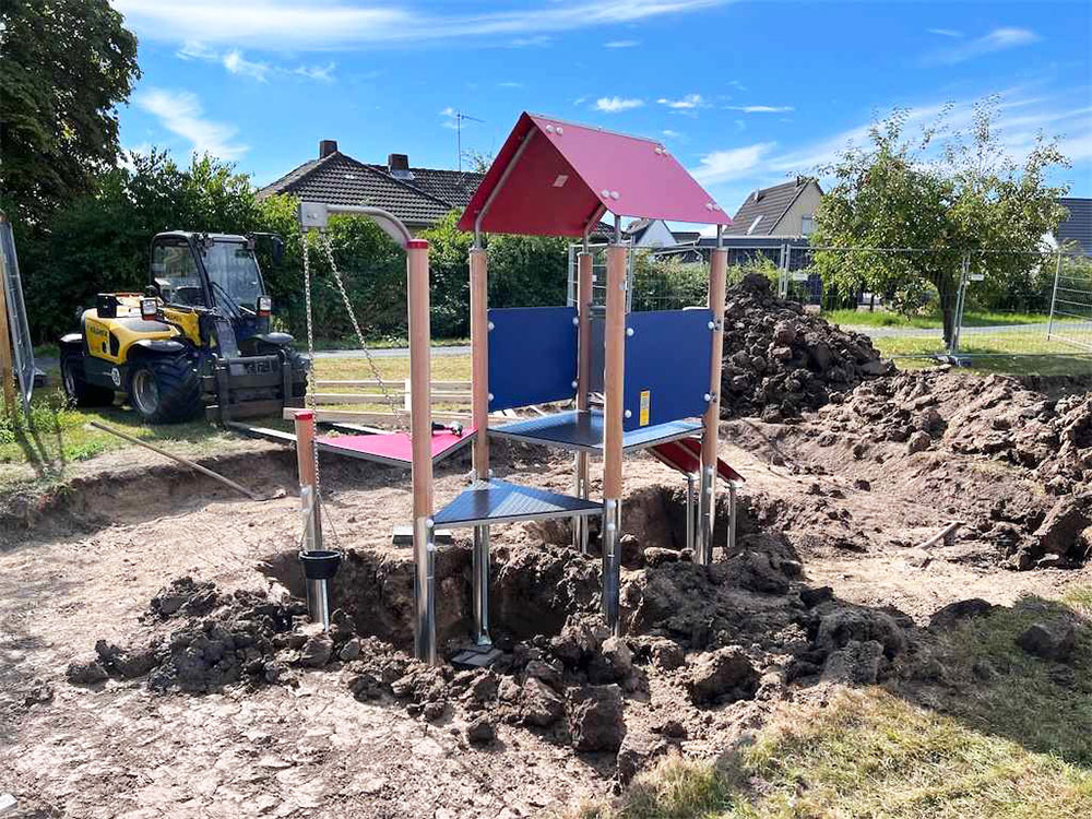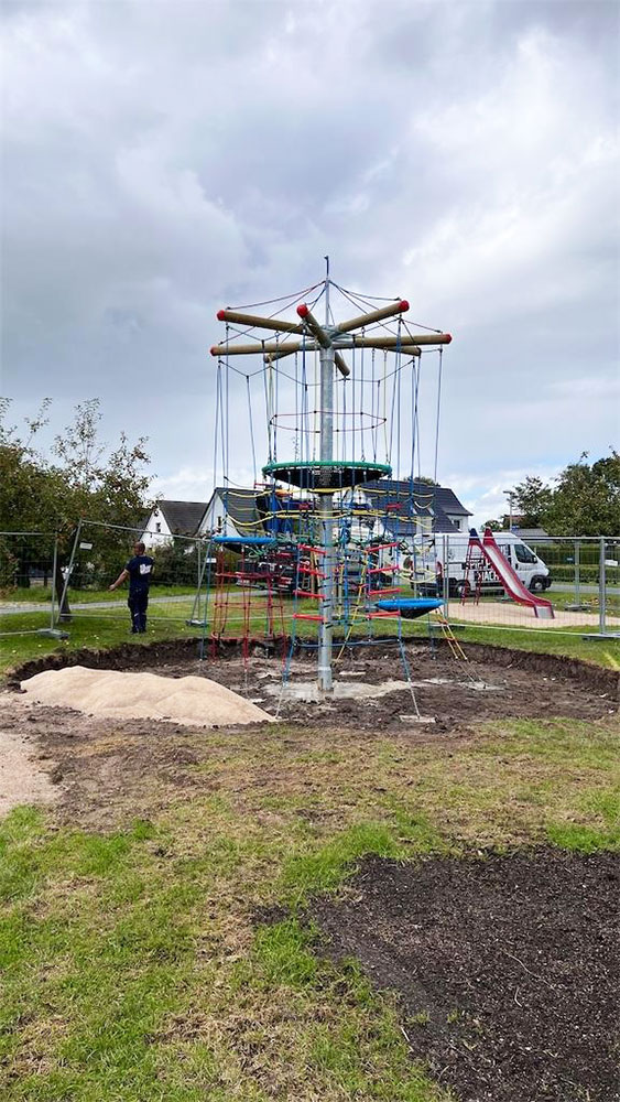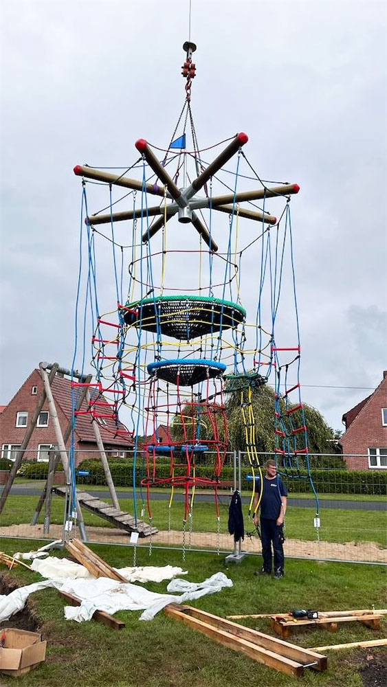 „Start frei für den Spielplatzsommer 2022!“ Das war das Motto des Senders Radio ffn und der Stiftung Sparda-Bank Hannover. Verschiedene Orte in Niedersachsen konnten sich um einen neuen Spielplatz bewerben und sechs wurden Gewinner. Darunter auch Nordenham in der Wesermarsch. Hier sollte unsere Mannschaft nun ihr Können im Spielplatzbau beweisen. Nichts lieber als das! Bei der Montage half uns ein nützlicher Kollege – unser Spielplatzkran, der mit seinem langen Schwenkarm Bauteile durch die Luft hievte. Damit haben wir tolle Spielgeräte installiert: zwei bunte Spieltürme, ein Bodentrampolin, eine Doppelschaukel und einen Seilkletterturm mit drei Nestschaukeln. Die Kinder nun so dankbar und glücklich spielen zu sehen, ist wunderbar und das Schönste an unserer Arbeit.