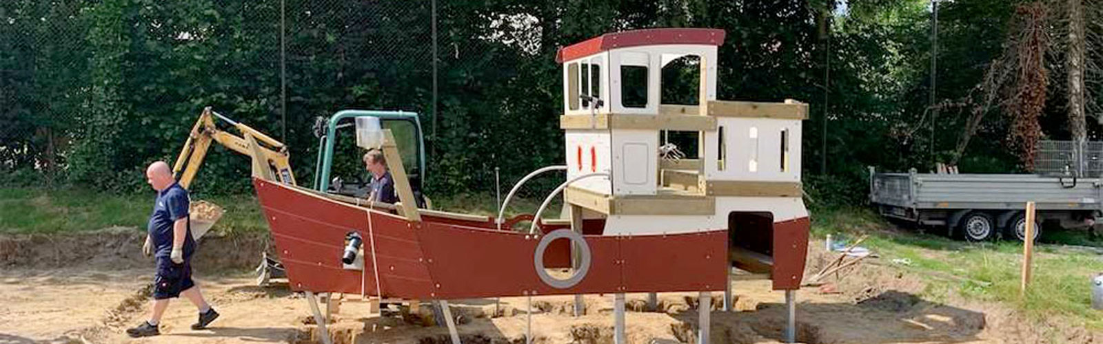 Schiff ahoi – hier kommt die Lustige Lotte! Diesen neuen Kletterturm für kleine Seeleute haben die Spielplatz-Macher geliefert und montiert. Zu den Arbeiten gehört auch der Aushub der Fundamentlöcher und das Einbringen des Fundamentbetons. Die Kinder in dem kleinen niedersächsischen Ort sind begeistert, denn nun können sie als Kapitän auf der Kommandobrücke das Steuerrad lenken, als Matrose das weite Meer mit dem Fernrohr beobachten oder wie ein verwegener Pirat das Schiff entern. Dabei wird geklettert, gerutscht und natürlich reichlich Seemannsgarn gesponnen.