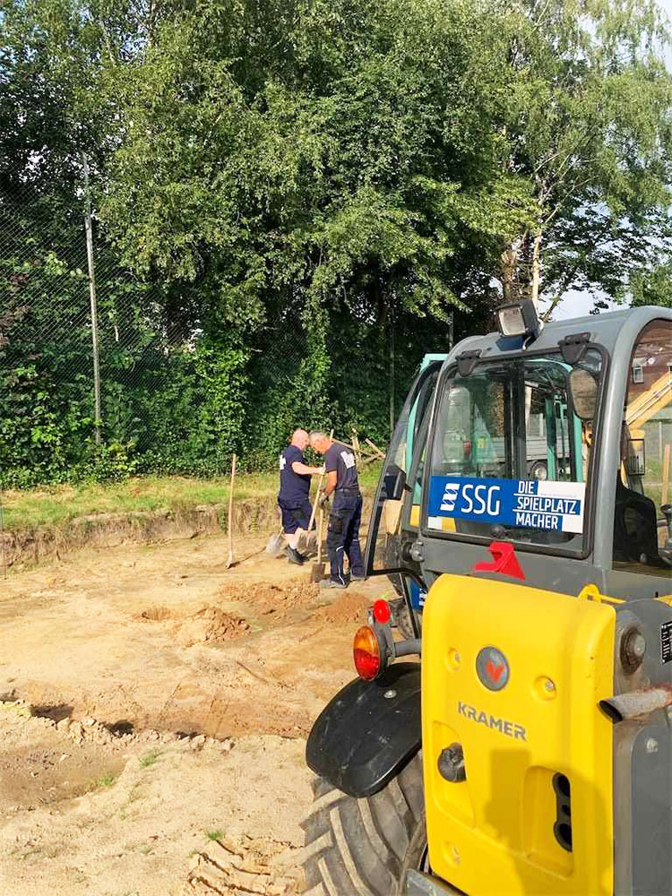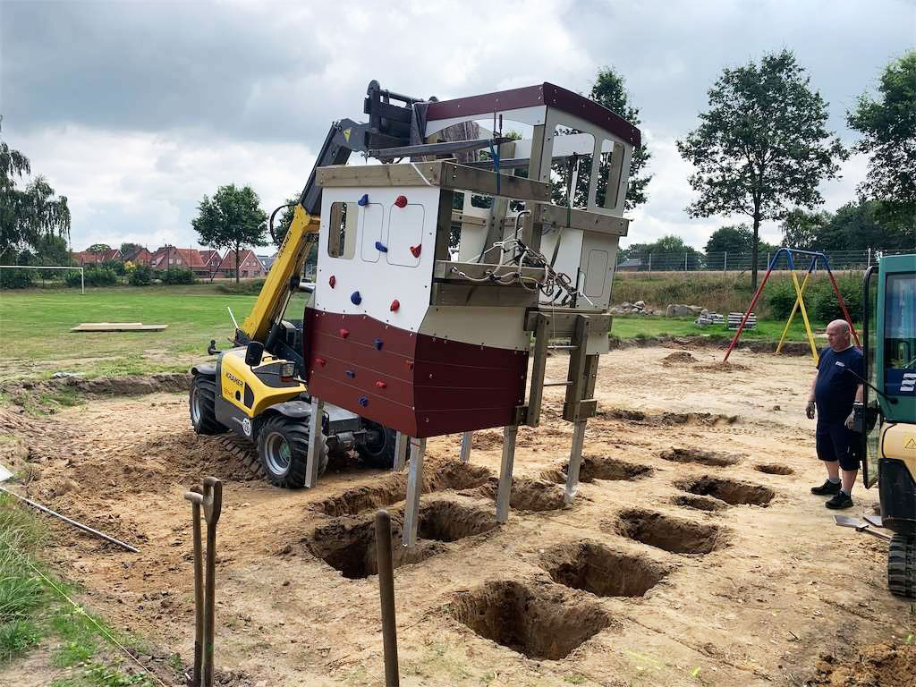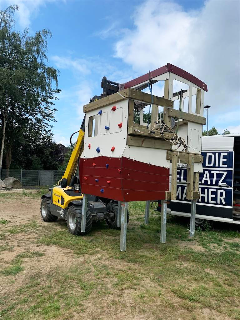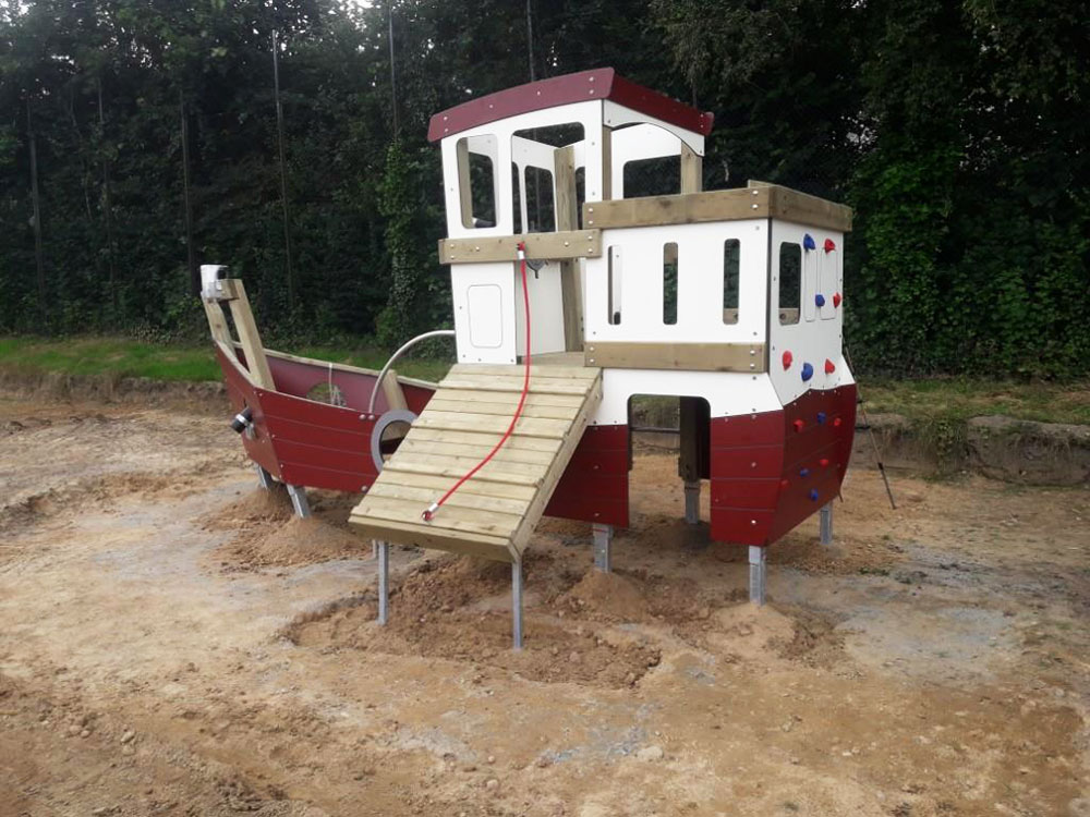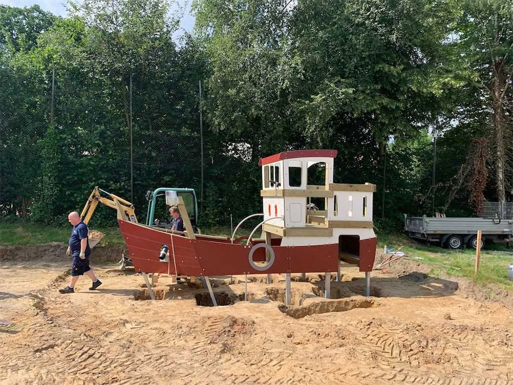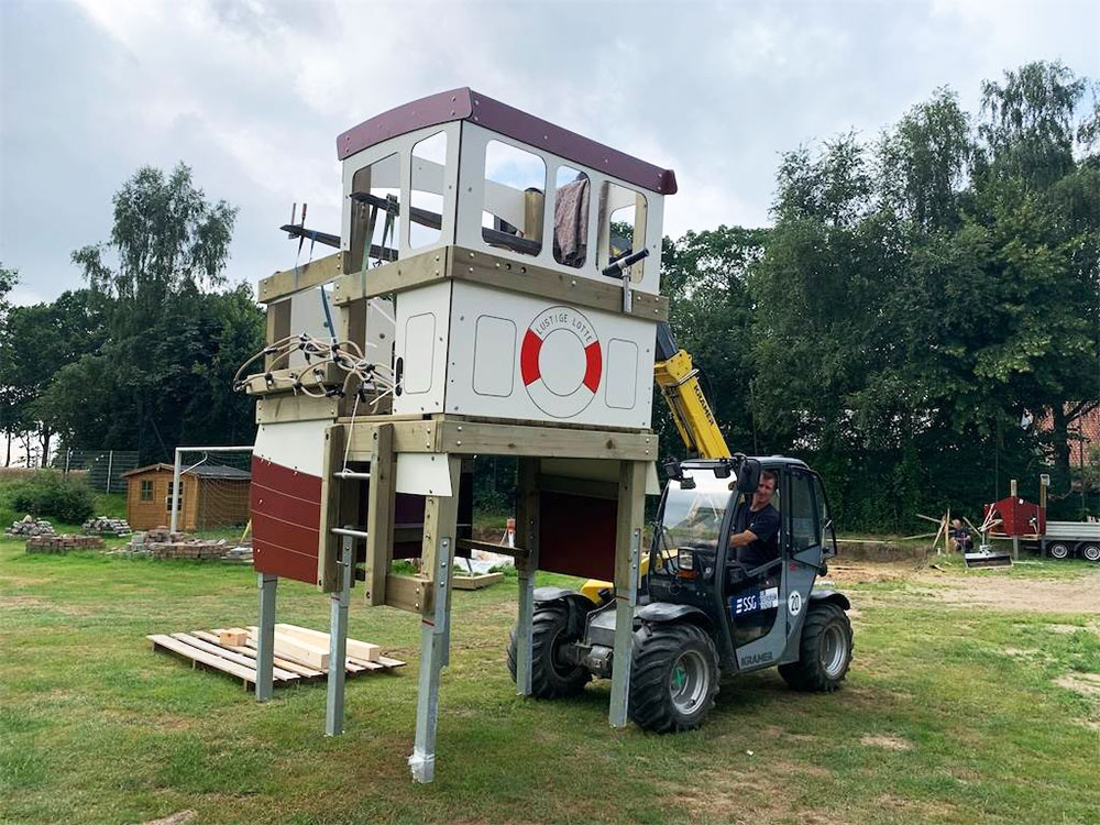 Schiff ahoi – hier kommt die Lustige Lotte! Diesen neuen Kletterturm für kleine Seeleute haben die Spielplatz-Macher geliefert und montiert. Zu den Arbeiten gehört auch der Aushub der Fundamentlöcher und das Einbringen des Fundamentbetons. Die Kinder in dem kleinen niedersächsischen Ort sind begeistert, denn nun können sie als Kapitän auf der Kommandobrücke das Steuerrad lenken, als Matrose das weite Meer mit dem Fernrohr beobachten oder wie ein verwegener Pirat das Schiff entern. Dabei wird geklettert, gerutscht und natürlich reichlich Seemannsgarn gesponnen.