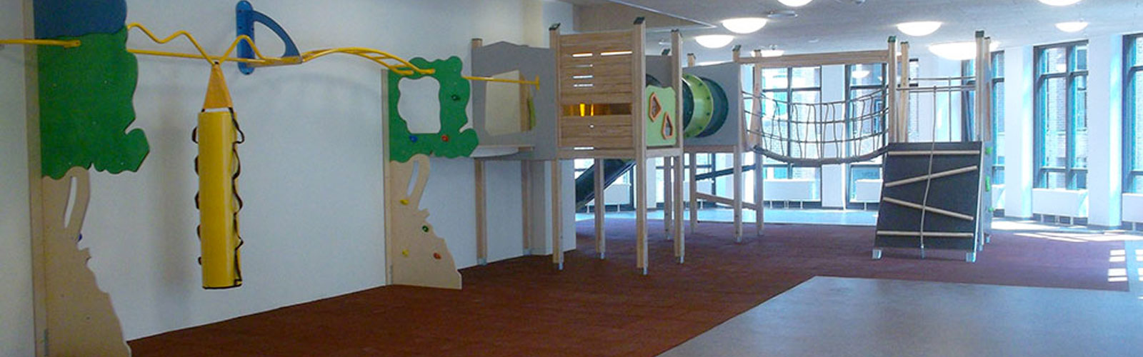 Die Spielplatz-Macher können nicht nur draußen, wir können auch drinnen! Das beweist die endlos lange Spielwand, die wir in dieser Kita gebaut haben. Hier finden die Kinder alles, was das Herz begehrt: Sie können hangeln, klettern, eine Burg erobern, durch eine Röhre rutschen, über ein Netz balancieren und vieles mehr. Das fördert Motorik, Geschicklichkeit, Teamgeist und Fantasie. Viel Spaß!