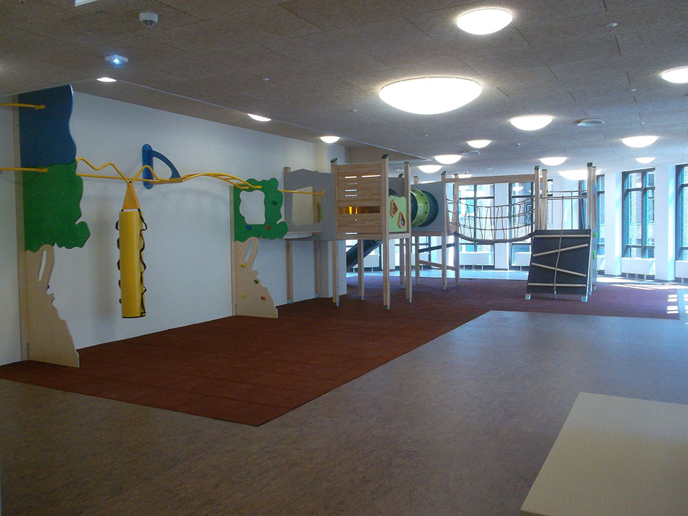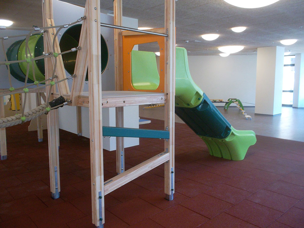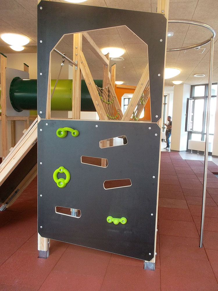 Die Spielplatz-Macher können nicht nur draußen, wir können auch drinnen! Das beweist die endlos lange Spielwand, die wir in dieser Kita gebaut haben. Hier finden die Kinder alles, was das Herz begehrt: Sie können hangeln, klettern, eine Burg erobern, durch eine Röhre rutschen, über ein Netz balancieren und vieles mehr. Das fördert Motorik, Geschicklichkeit, Teamgeist und Fantasie. Viel Spaß!