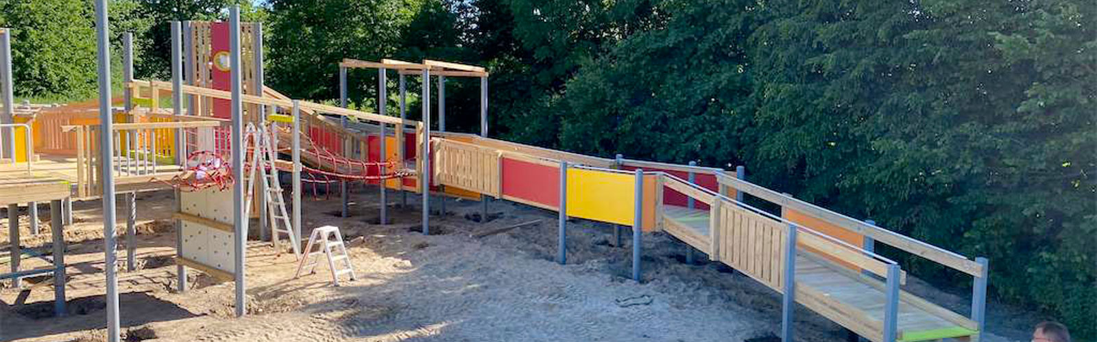 Für viele Kinder, die nicht laufen können oder anderweitig eingeschränkt sind, bleibt das Spielen mit anderen auf einem Spielplatz auch heute noch ein Traum. Nur wenige Spielplätze in Deutschland bieten bisher einen Zugang und geeignete Geräte Menschen mit Behinderung. Die siebenjährige Rollstuhlfahrerin Lena aus Flensburg hat Glück. Dort lässt die Just-Hansen-Stiftung derzeit einen integrativen Spielplatz erbauen, auf dem Kinder mit und ohne Handicap gemeinsam Spaß haben und ihre Fähigkeiten entfalten sollen. Die Spielplatz-Macher, die der Stiftung zu Weihnachten 2018 bereits einen Federwipper gespendet hatten, wurden von den Verantwortlichen gefragt, ob sie sich an der Gestaltung des neuen Spielplatzes beteiligen möchten. Und ob! Also sind wir aus Hamburg angerückt und haben eine abwechslungsreiche Spiellandschaft montiert, die für alle Generationen über Rampen zugänglich ist. Konstrastfarbene Bodenelemente mit unterschiedlichen Strukturen erleichtern die Orientierung auf dem weitläufigen Spielgerät. Jetzt können Kinder wie Lena alle anderen ganz selbstverständlich fragen: „Wollen wir auf den Spielplatz gehen?“