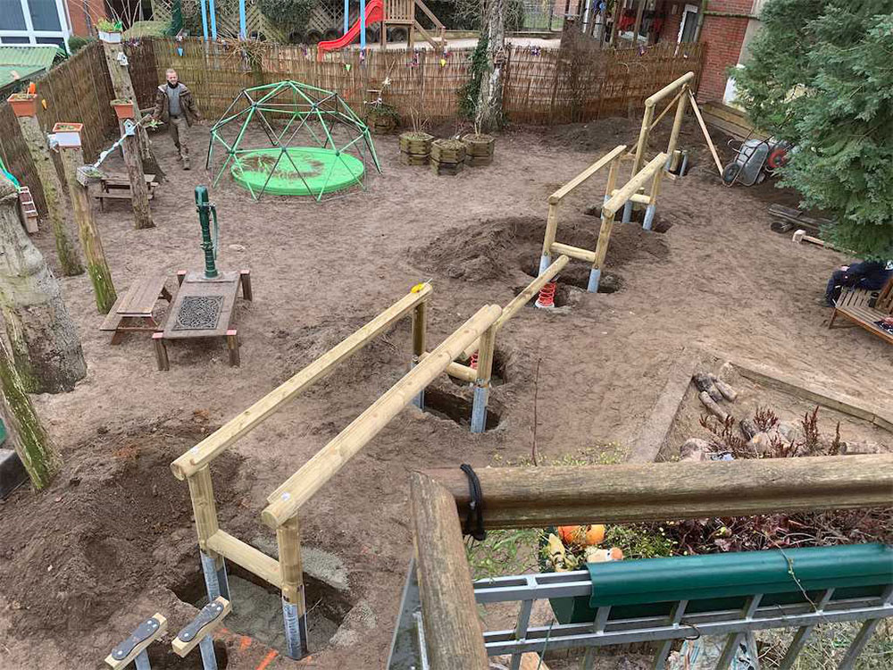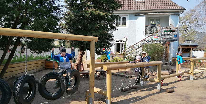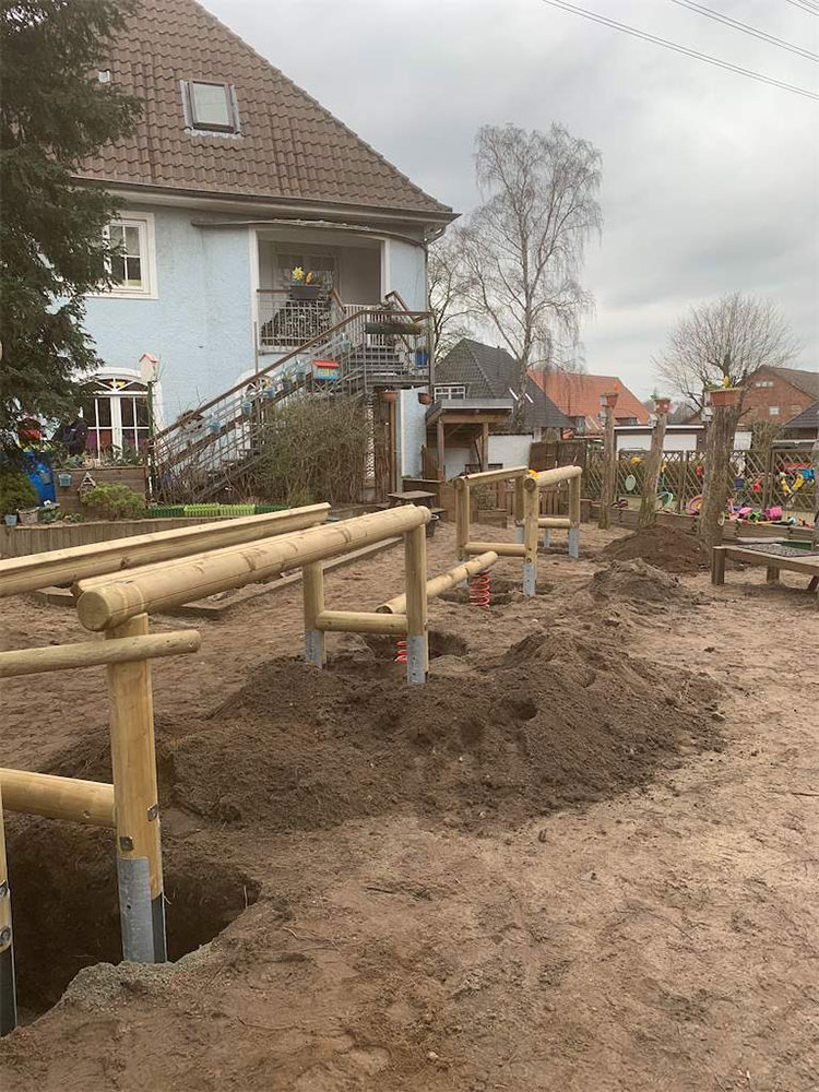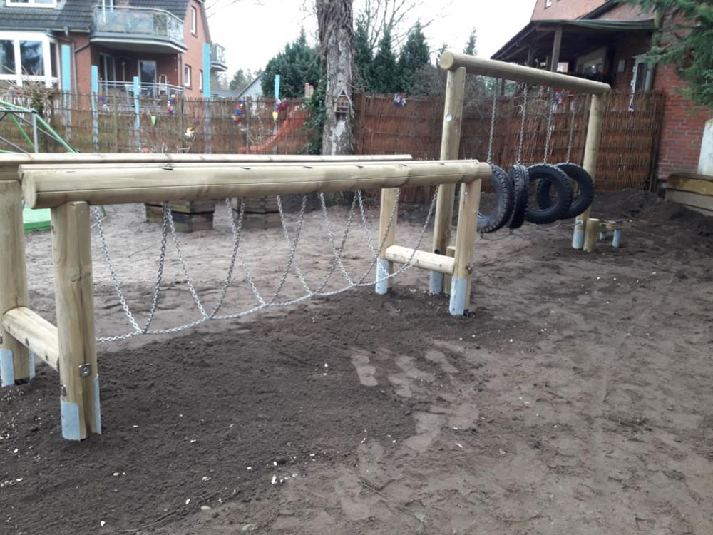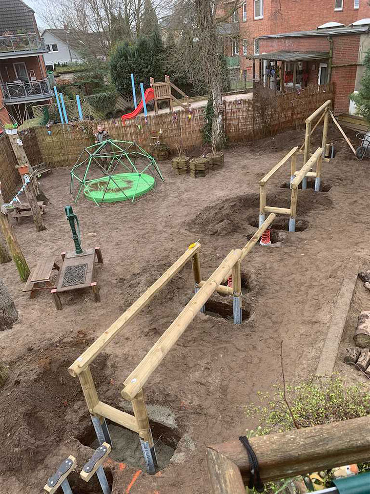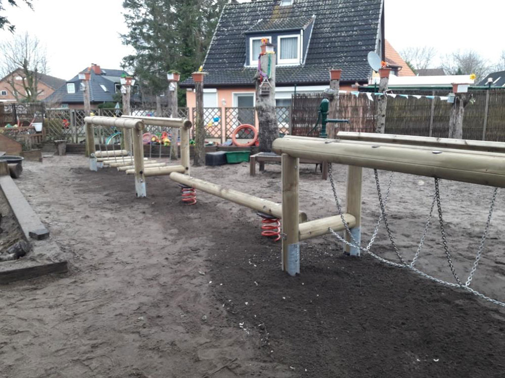 Die Kita Wundertüte in Hamburg-Schnelsen bietet ihren Kindern gern jede Gelegenheit, sich viel und abwechslungsreich zu bewegen. Dazu bot sich früher das bei den Mädchen und Jungen beliebte Holzschiff an, doch das musste irgendwann aus Sicherheitsgründen entfernt werden. Was nun? Die Pädagoginnen suchten eine neue, herausfordernde Klettermöglichkeit und einigten sich mit unserer Mannschaft auf eine tolle Kletterstrecke, die u.a. Kraft, Gleichgewichtssinn und Kreativität trainiert. Wir haben die Anlage geliefert, einschließlich Fundamentbetonarbeiten montiert und die TÜV-Abnahme veranlasst. Und wie finden die Kinder das neue Spielgerät? Na, die sind begeistert und turnen, wann immer sie draußen sind, darin herum. Übrigens: Da der Verein Wundertüte die Anlage nicht vollständig aus Eigenmitteln finanzieren konnte, sprangen zwei renommierte Hamburger Institutionen ein: der Radio Hamburg Hörer helfen Kindern e.V. und die Erika und Ilse Töllke Stiftung. Herzlichen Dank für so viel Engagement!