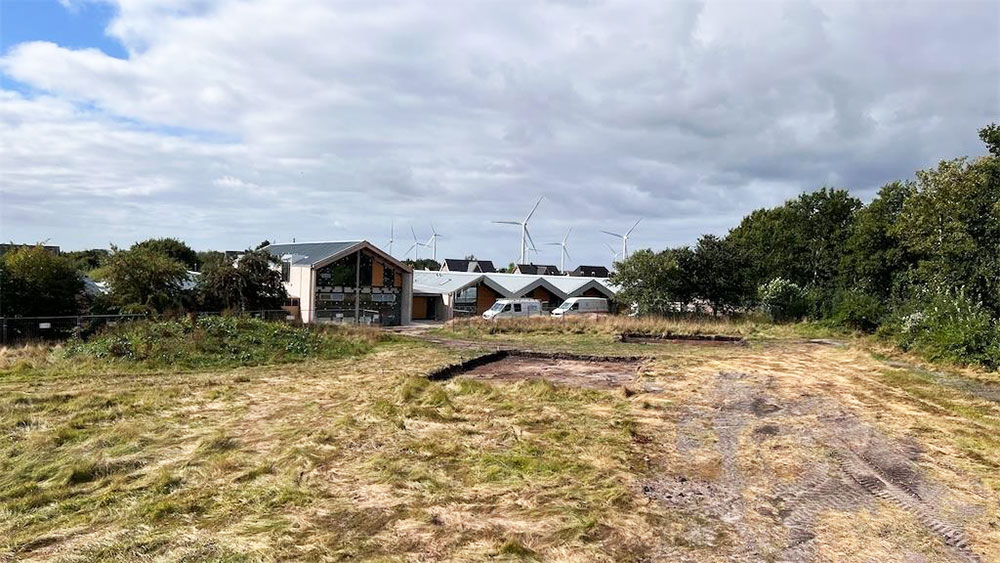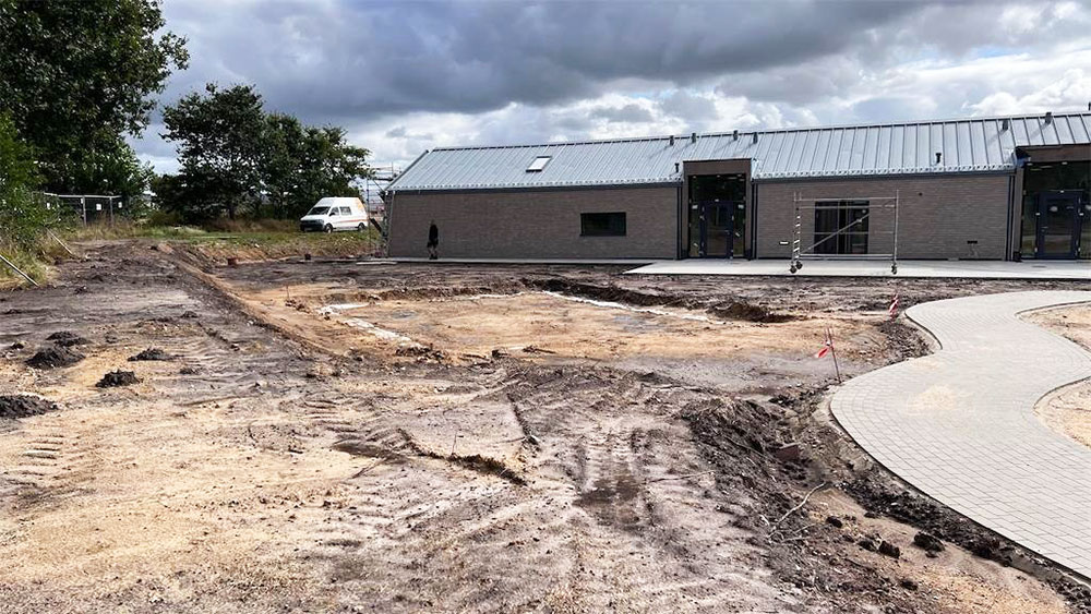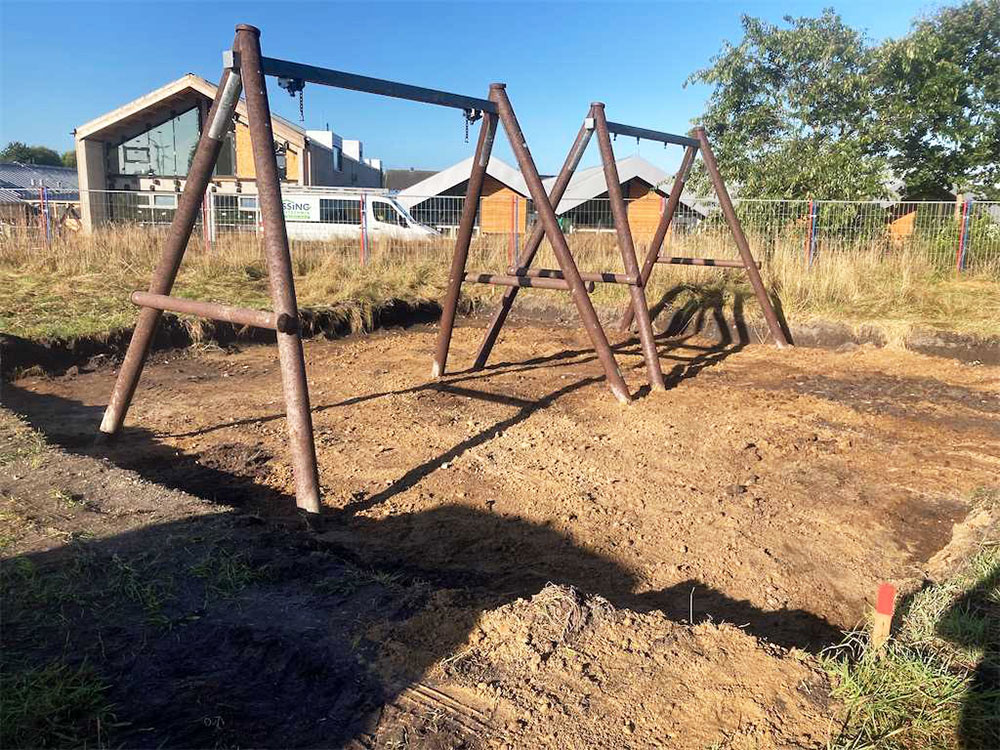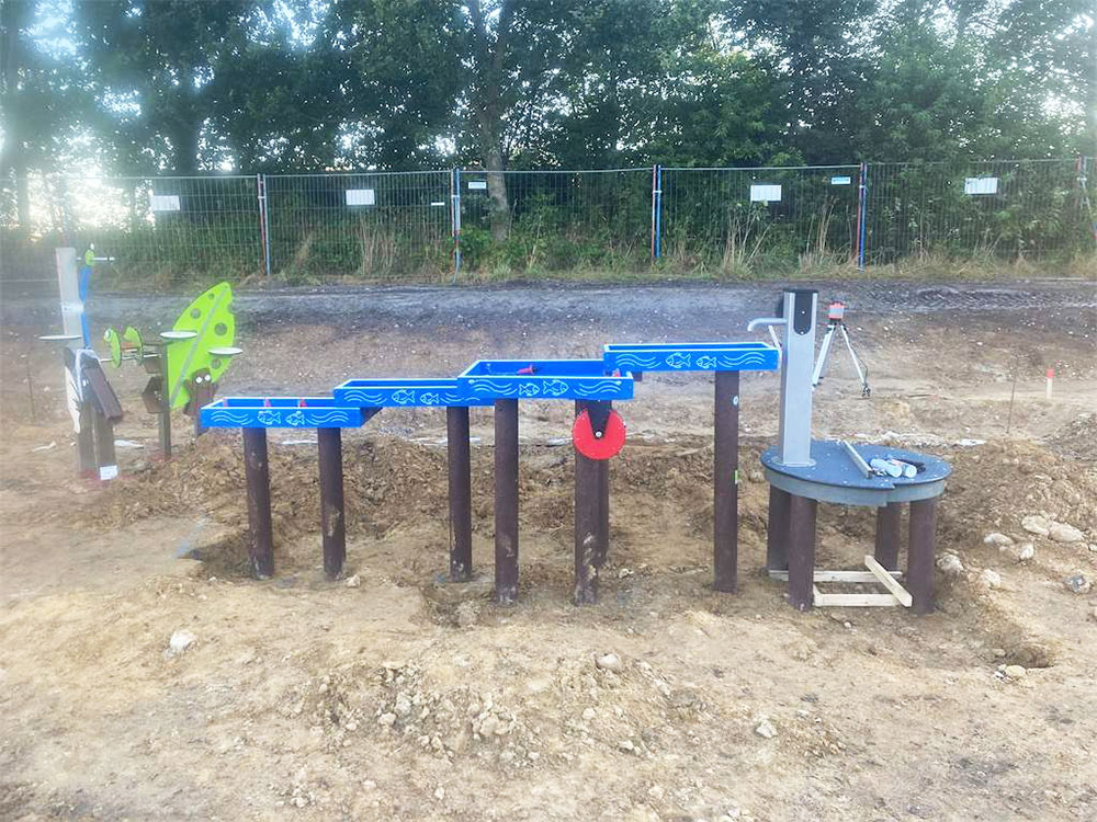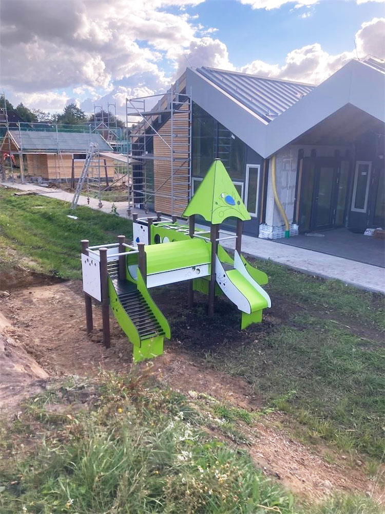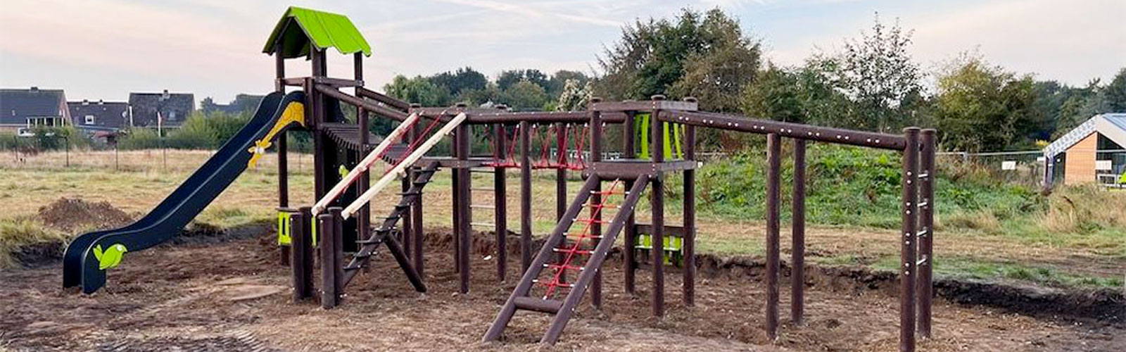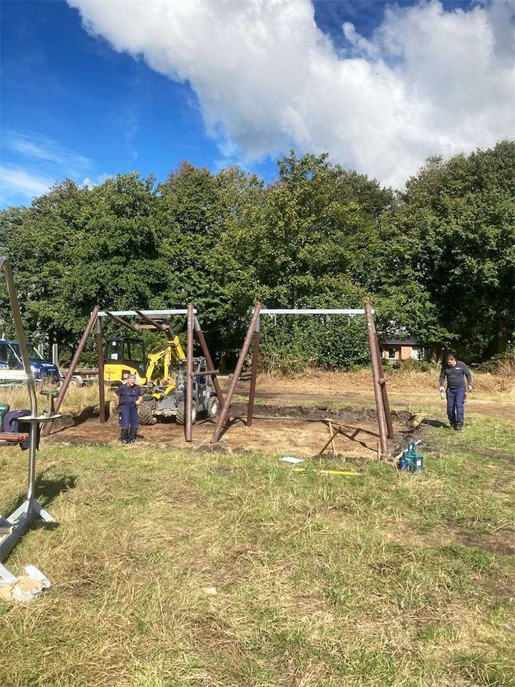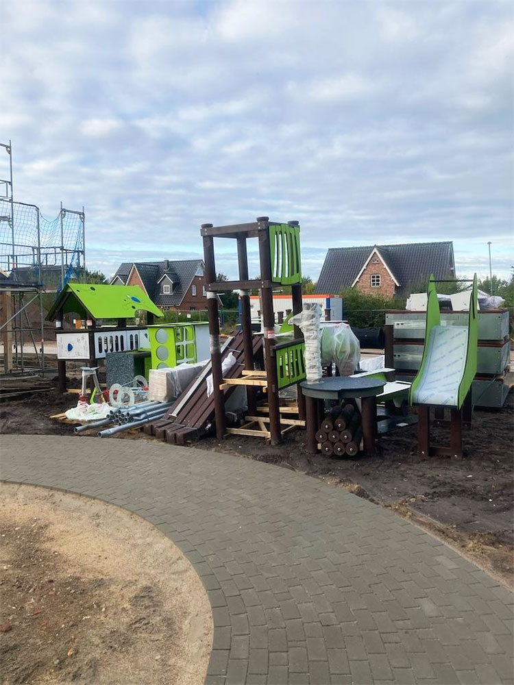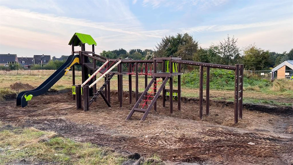 Hier stand eine leere Fläche zur Verfügung. Wir haben die gewünschten Standorte für die Spielgeräte eingemessen, angezeichnet und konnten danach mit dem Aushub der Fallschutzflächen für die Spielgeräte beginnen. Der Aushub wurde ausgebaggert und fachgerecht entsorgt. Dann begann die Montage der Spielgeräte: ein Klettergerüst mit zwei Rutschen, eine Wippe, eine Schaukel, eine Kriechröhre und eine weitere Rutsche. Nach der Montage der Spielgeräte wurde die spätere Fallschutzfläche mit Vlies belegt und anschließend das Fallschutzmaterial in Form von Spielsand und Fallschutzkies geliefert und in die Flächen eingebracht. Zum Schluss haben wir die übrige Spielfläche gewalzt und mit Rasensaat belegt.