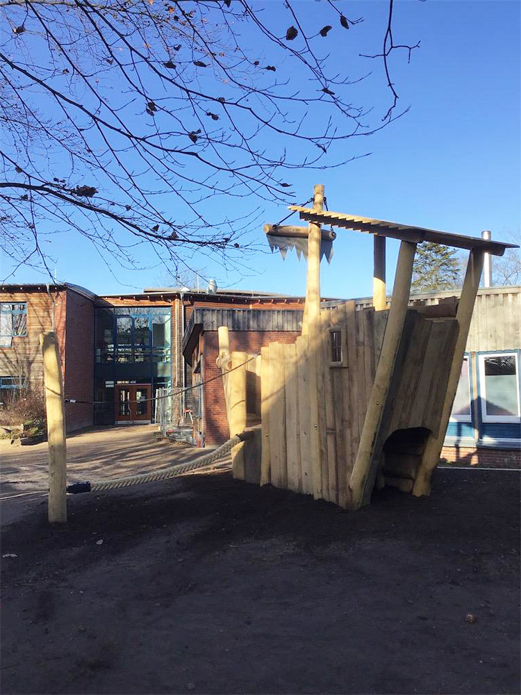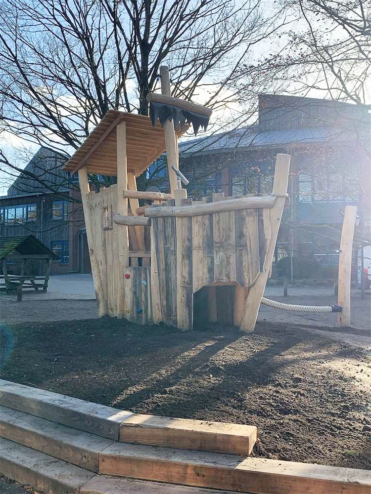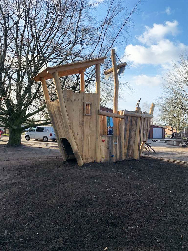 Ahoi! Die Schulleitung im schleswig-holsteinischen Kaltenkirchen wusste genau, was sie wollte: ein extra für ihre kleineren Schülerinnen und Schüler angefertigtes Spielschiff. Gesagt, getan. Wir entwarfen einen Bauplan für das Spielschiff und bestellten die Holzrohware. Dann gingen unsere Tischler ans Werk und errichteten das urige Unikat, für das unsere Garten- und Landschaftsbauer einen „sicheren Hafen“ vorbereiteten. Die Taufe wurde mit großem Hallo gefeiert, und in jeder Pause freuen sich die Kinder nun auf eine Fahrt mit ihrem einzigartigen Holzschiff. Leinen los!