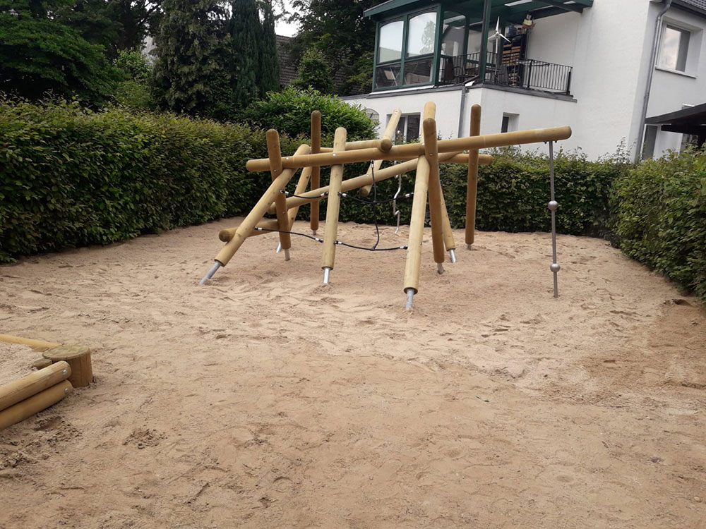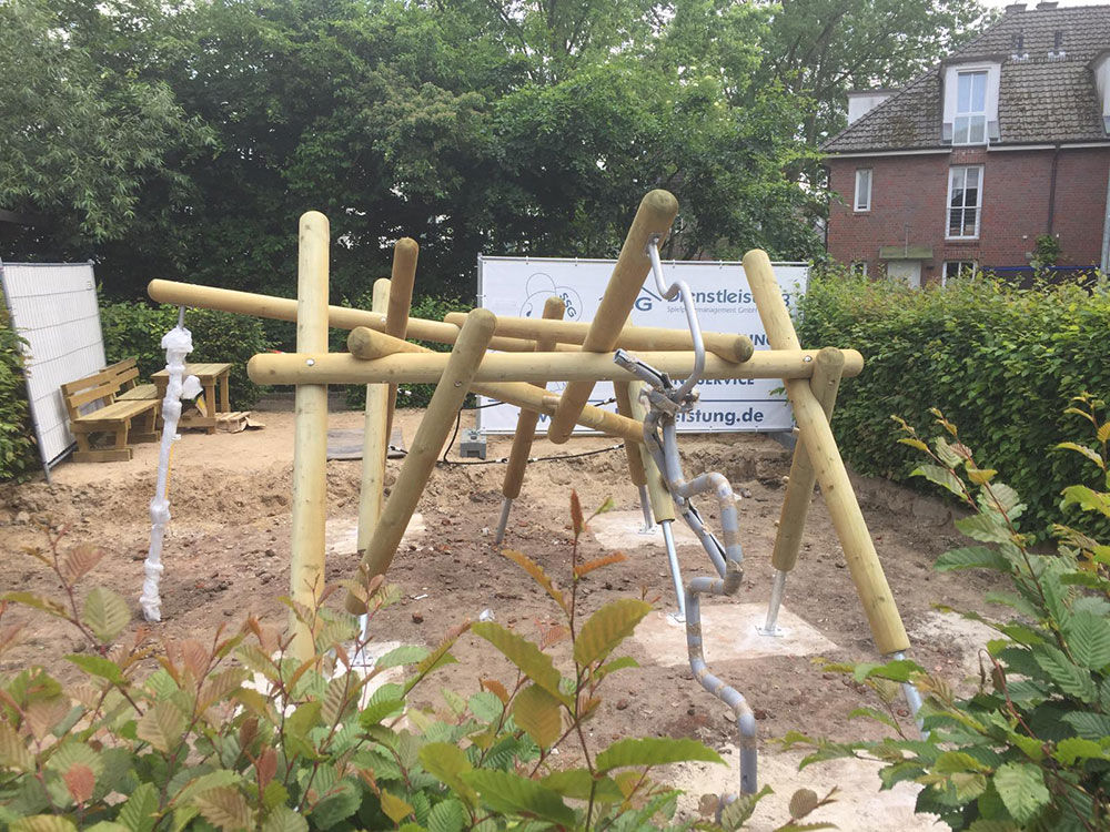Auch unter erschwerten Platzbedingungen gelingt es unserer Mannschaft, etwas auf die Beine zu stellen. In diesem Fall einen tollen Spielplatz zum Klettern, Sandburgenbauen und Ausruhen. Alle Teile und Materialien haben wir geliefert, die Spielgeräte montiert und Fallschutzkies eingebracht. Die von uns aufgestellte Baustellensicherung wurde am Schluss wieder abtransportiert und der Platz sauber und spielfertig hinterlassen.