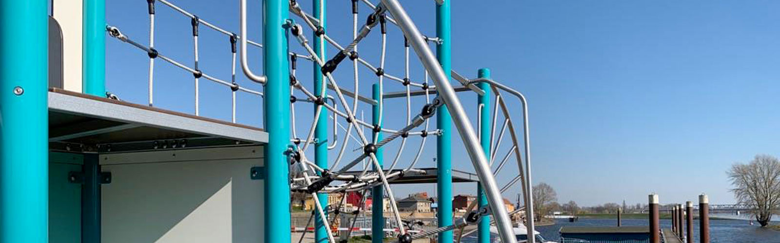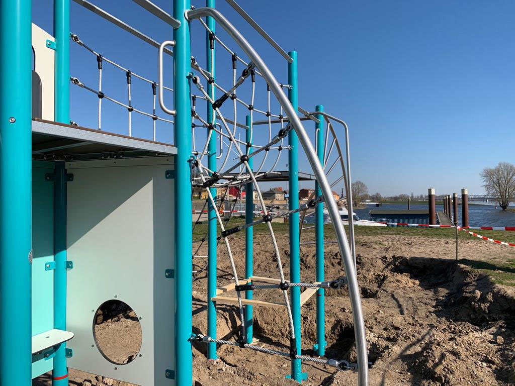 Direkt an der Elbe, im Nordwesten Brandenburgs, haben wir einen Spielturm mit Rutsche und Kletternetz montiert. Jetzt können die Kinder in Wittenberge „schwindelerregende“ Höhen erklimmen, wie Piraten das Wasser nach Schiffen ausspähen und anschließend mit Schwung in die Tiefe sausen. Ahoi!