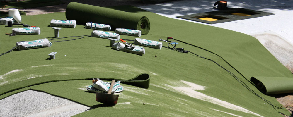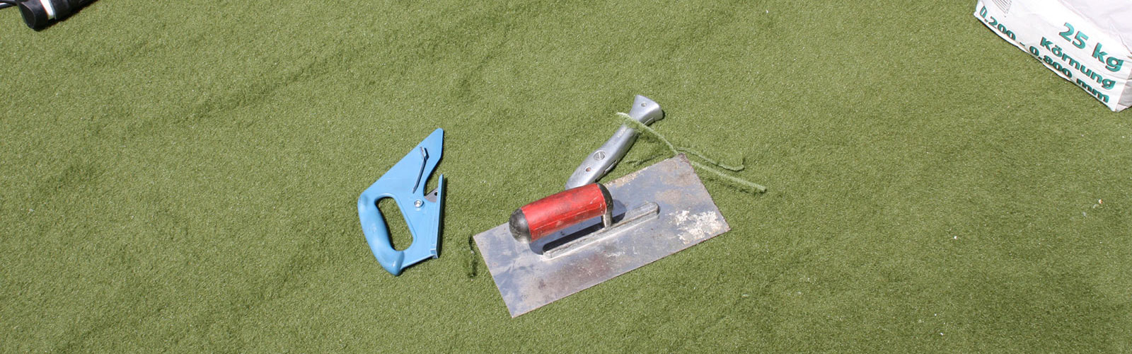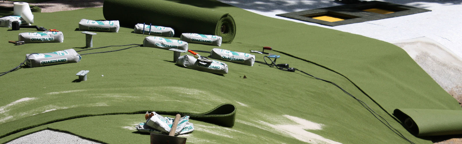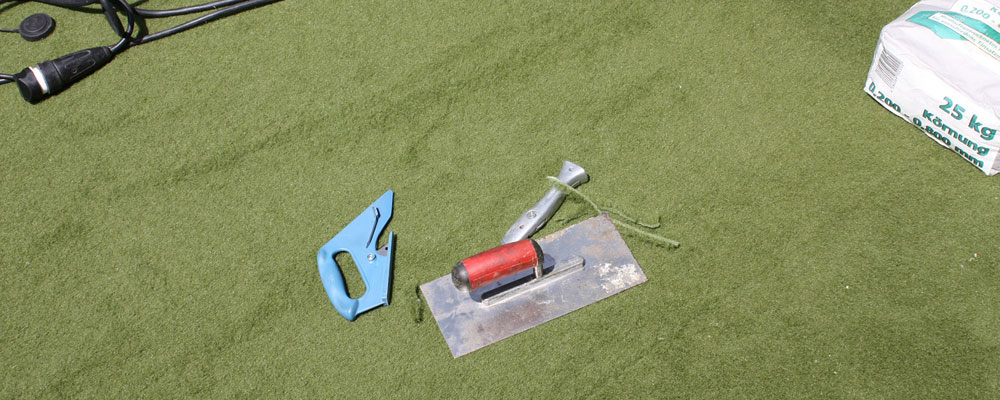 Nach der fachgerechten Verlegung füllen wird das Material mit Quarzsand auf, um es vor Schäden durch Vandalismus zu schützen. Versuche von Spielverderbern, die Fläche zu verbrennen oder mit einem Messer zu beschädigen, schlagen dann nämlich fehl. Der eingefüllte Quarzsand verhindert auch, dass sich Schmutz im Gewebe festsetzt. Das Teppichvlies befestigen wir entweder zwischen einem Betonbord und einer Betonplatte oder in einer Fuge zwischen zwei Betonborden.