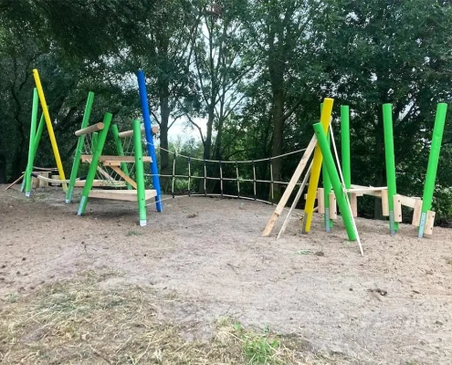 Als Fallschutz (zum Beispiel für Calisthenics-Anlagen oder Fitnessgeräte im Außenbereich) verlegen wir unter dem Vlies entweder eine Schicht aus PEX-Schaum oder Pads aus expandiertem Polypropylen. Diese haben eine Craddle-to-Craddle-Zertifizierung: Sie werden umweltschonend hergestellt, können nach Gebrauch abgebaut und an anderer Stelle einfach weitergenutzt werden.
